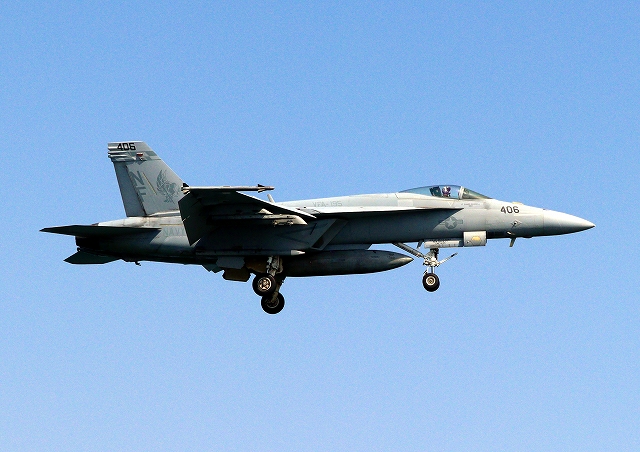 米海軍艦載機 F/A-18E スーパーホーネット 戦闘攻撃機(岩国基地)、NF、406番機が着陸 |
