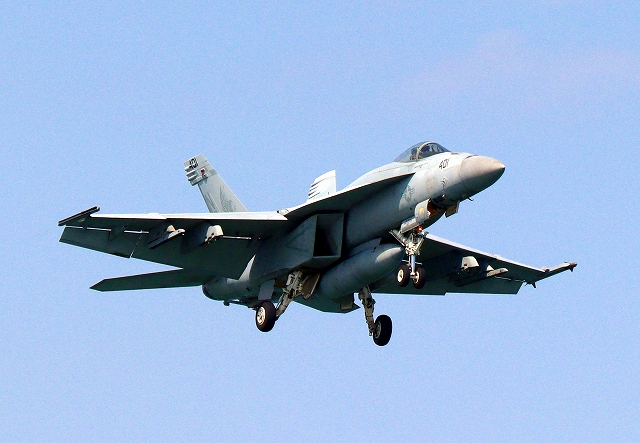 米海軍艦載機 F/A-18E スーパーホーネット 戦闘攻撃機(岩国基地)、NF、401番機が帰還 |