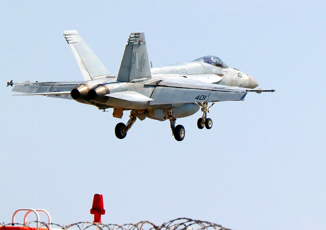 米海軍艦載機 F/A-18E スーパーホーネット 戦闘攻撃機(岩国基地)、NF、401番機が着陸 |
