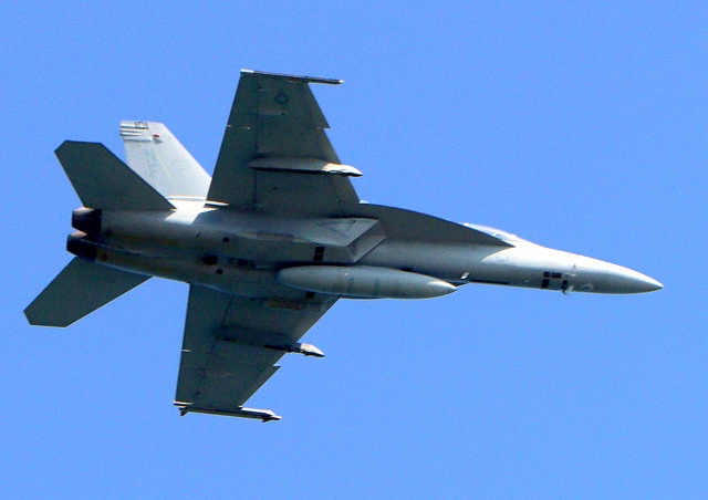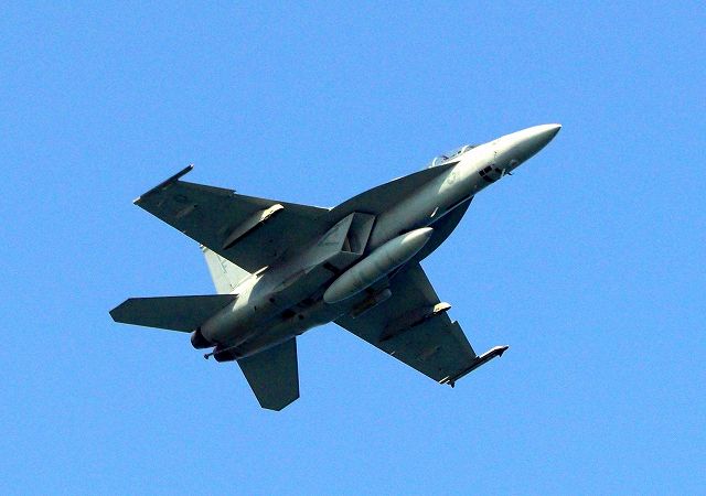 米海軍艦載機 F/A-18F スーパーホーネット 戦闘攻撃機(岩国基地)、NF、101番機が帰還、旋回 |