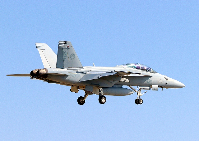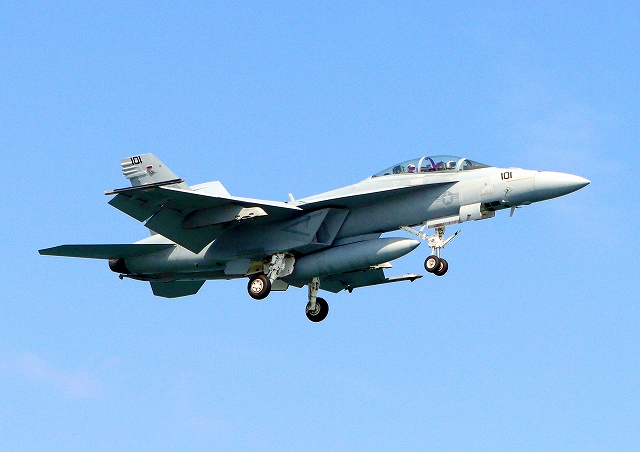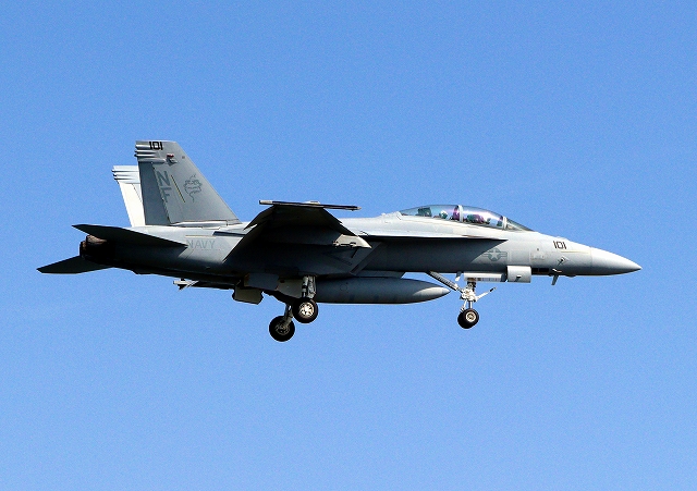 米海軍艦載機 F/A-18F スーパーホーネット 戦闘攻撃機(岩国基地)、NF、101番機が着陸 |