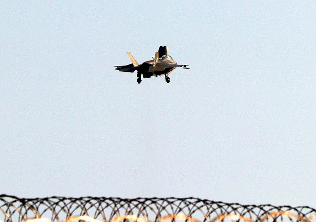 米海兵隊 F-35B ライトニングⅡ 戦闘機(岩国基地)、VK、03番機は南の垂直着陸パッドの上でホバリング |
