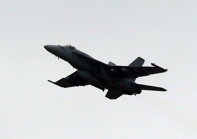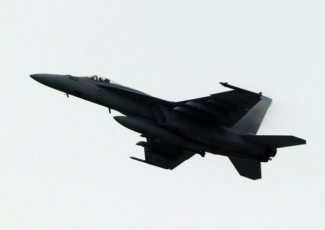 米海軍艦載機 F/A-18E スーパーホーネット 戦闘攻撃機(岩国基地)、NF、203番機が離陸 |