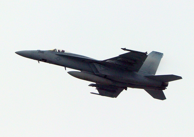 米海軍艦載機 F/A-18E スーパーホーネット 戦闘攻撃機(岩国基地)、NF、200番機が離陸 |