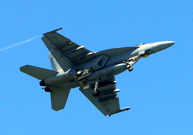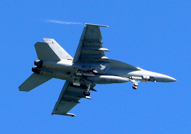 米海軍艦載機 F/A-18E スーパーホーネット 戦闘攻撃機(岩国基地)、NF、203番機が帰還、旋回 |