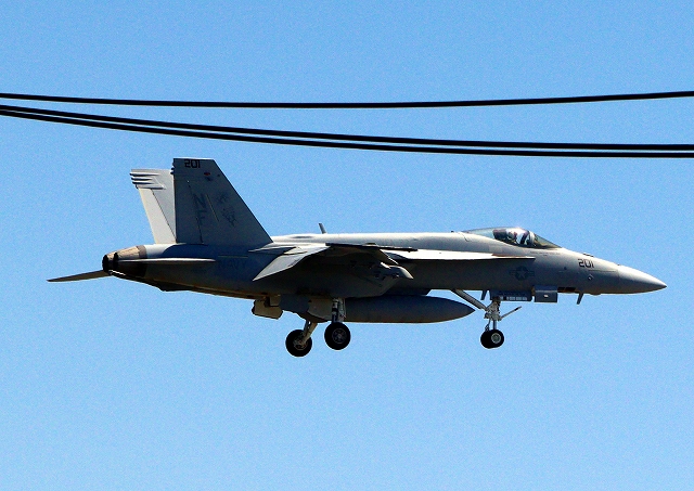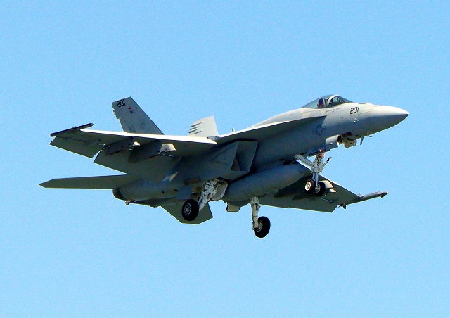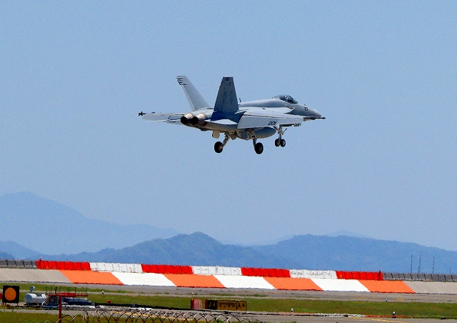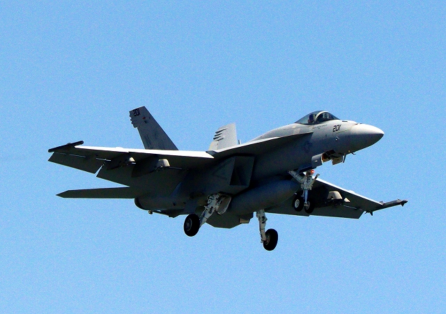 米海軍艦載機 F/A-18E スーパーホーネット 戦闘攻撃機(岩国基地)、NF、201番機が着陸 |