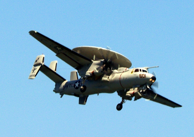 米海軍艦載機 E-2D アドヴァンスド・ホークアイ 早期警戒機(岩国基地)、601番機が旋回 |