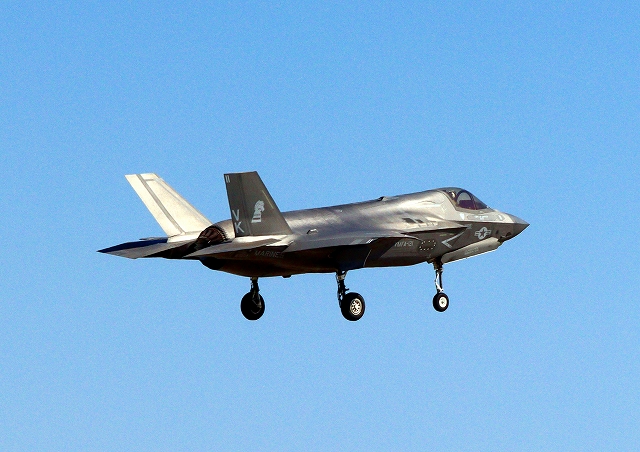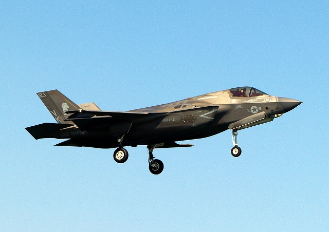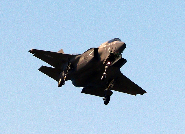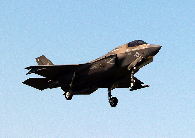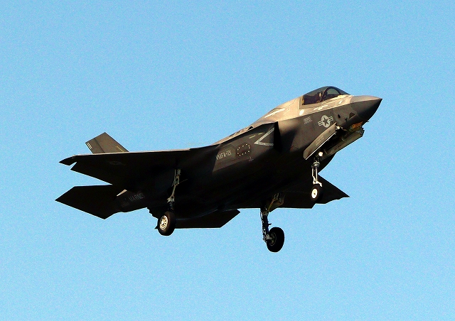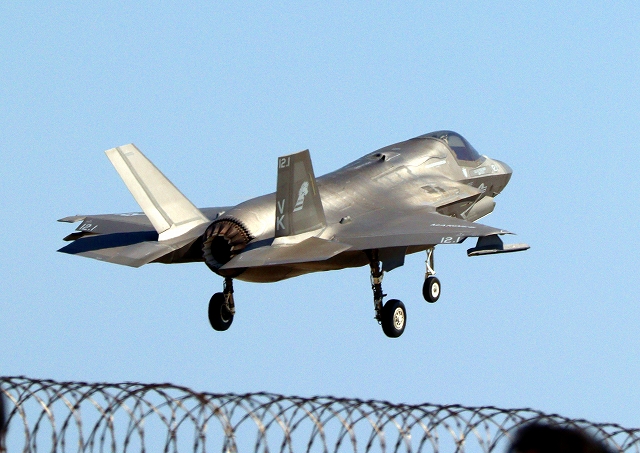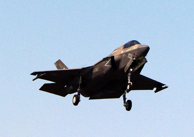 米海兵隊 F-35B ライトニングⅡ 戦闘機(岩国基地)、VK、11番機が着陸 |