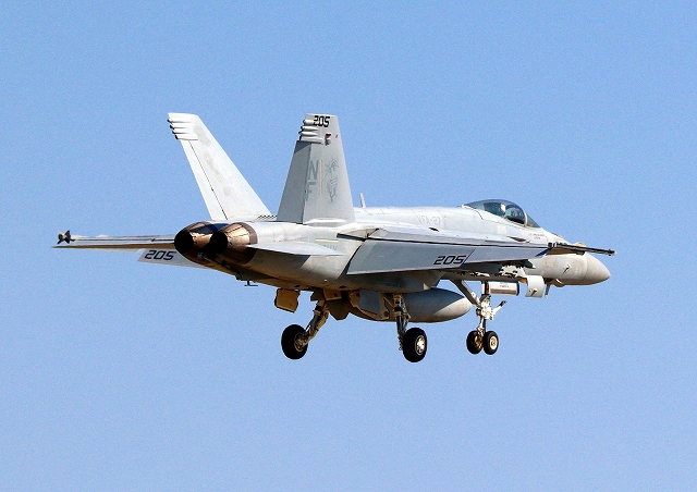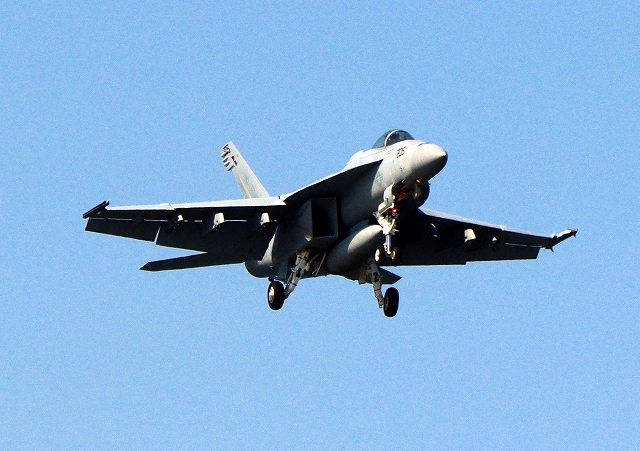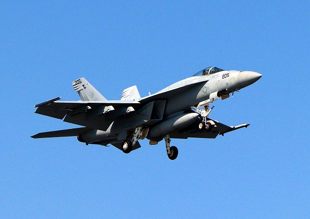 米海軍艦載機 F/A-18E スーパーホーネット 戦闘攻撃機(岩国基地)、NF、205番機が着陸 |