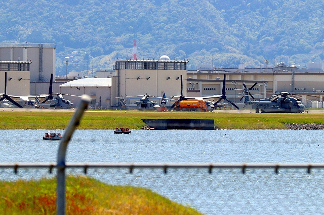 米海兵隊 CH-53E 強襲大型輸送ヘリ スーパースタリオン、AH-1Z 戦闘攻撃ヘリ バイパー、AH-1Z 戦闘攻撃ヘリ バイパー(普天間基地)、米海軍艦載機 CMV-22B オスプレイ(岩国基地)が見えます。 |
