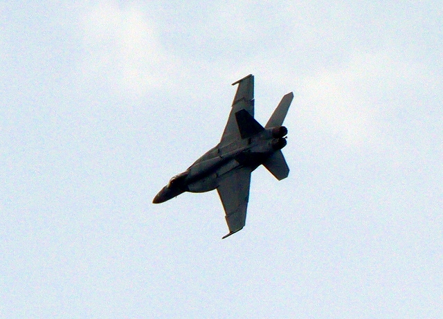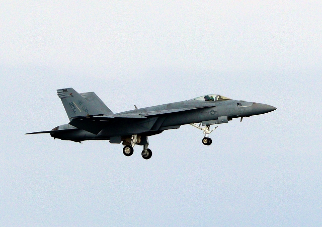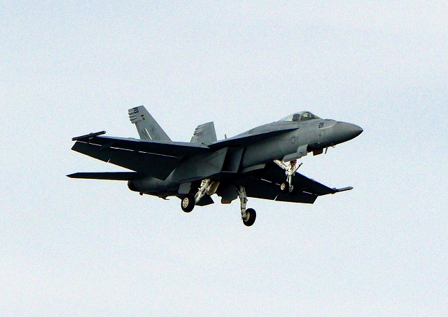 米海軍艦載機 F/A-18E スーパーホーネット 戦闘攻撃機(岩国基地)、NF、211番機がアクロバット飛行 |