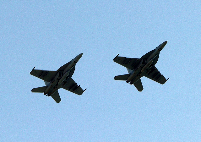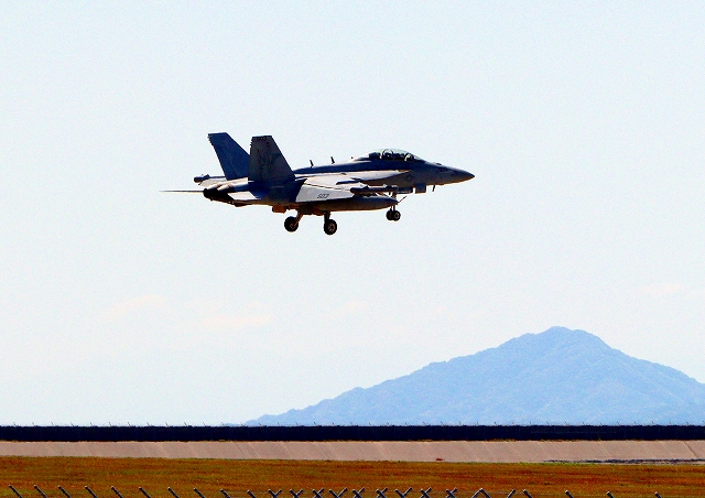 米海軍艦載機 F/A-18E スーパーホーネット 戦闘攻撃機(岩国基地)、NF、204番機、F NF 100番機が2機編隊で帰還 |