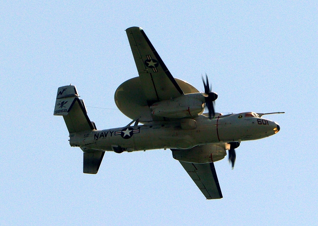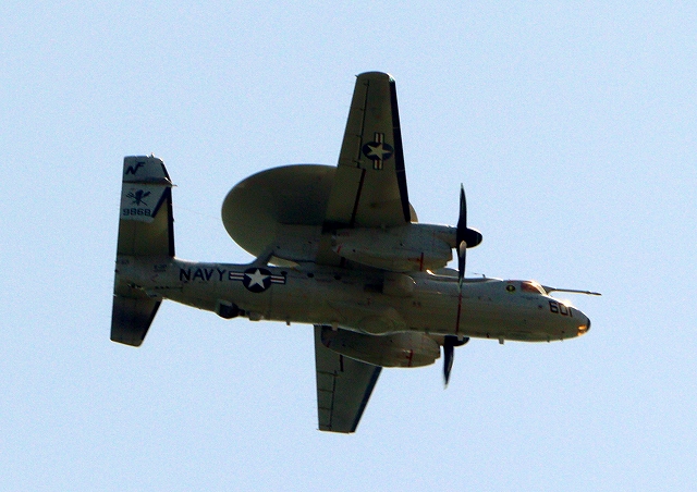 米海軍艦載機 E-2D アドヴァンスド・ホークアイ 早期警戒機(岩国基地)、601番機が旋回 |