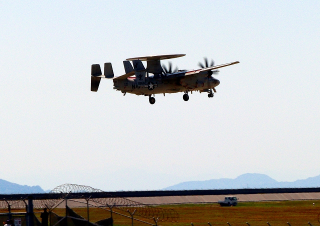 米海軍艦載機 E-2D アドヴァンスド・ホークアイ 早期警戒機(岩国基地)、601番機が着陸 |