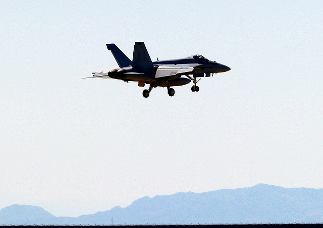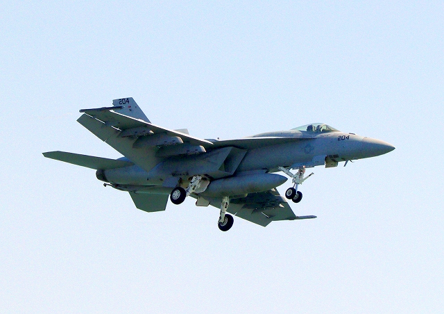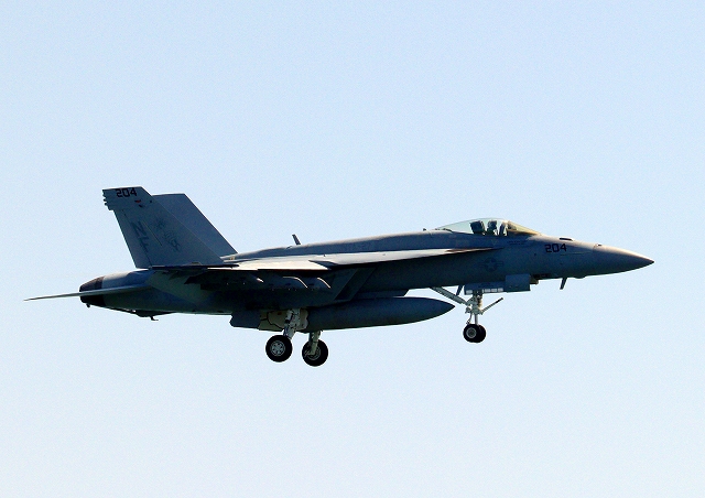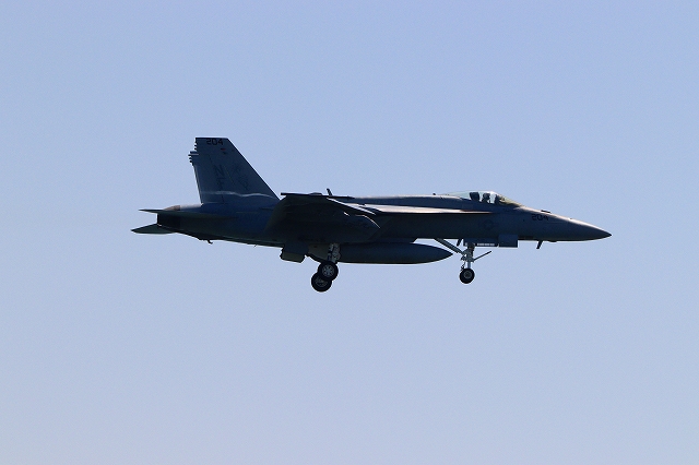 米海軍艦載機 F/A-18E スーパーホーネット 戦闘攻撃機(岩国基地)、NF、204番機が着陸 |