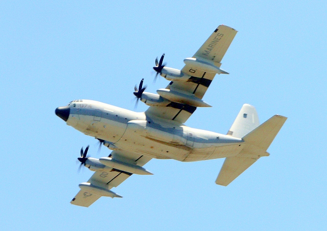 米海兵隊 KC-130J 空中給油機 スーパーハーキュリーズ(岩国基地)、QD 8074番機が旋回 |