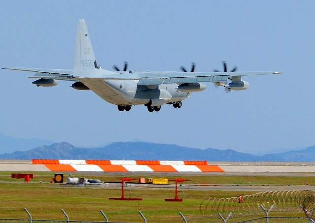 米海兵隊 KC-130J 空中給油機 スーパーハーキュリーズ(岩国基地)、QD 9532番機が着陸 |