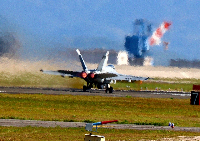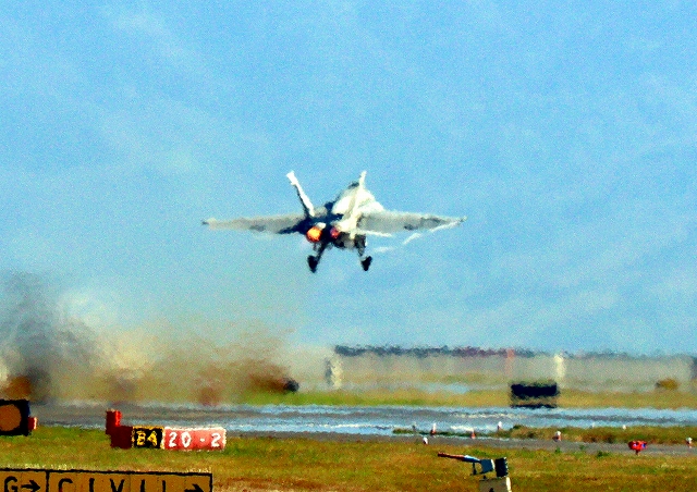 米海軍艦載機 F/A-18E スーパーホーネット 戦闘攻撃機(岩国基地)、NF 400番機が離陸 |