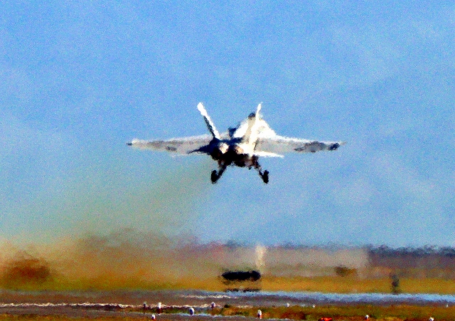 米海軍艦載機 F/A-18E スーパーホーネット 戦闘攻撃機(岩国基地)、NF 403番機が離陸 |