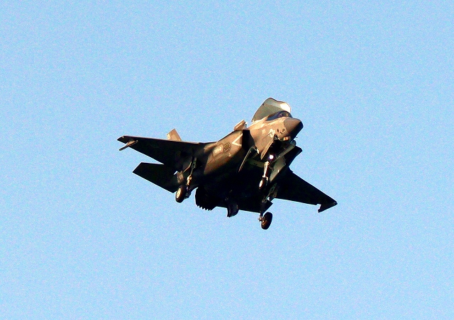 米海兵隊 F-35B ライトニングⅡ 戦闘機(岩国基地)、VK、09番機は南の垂直着陸パッドの上でホバリング |