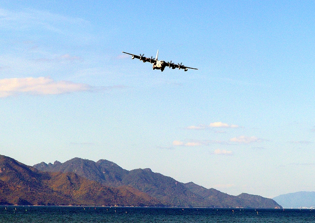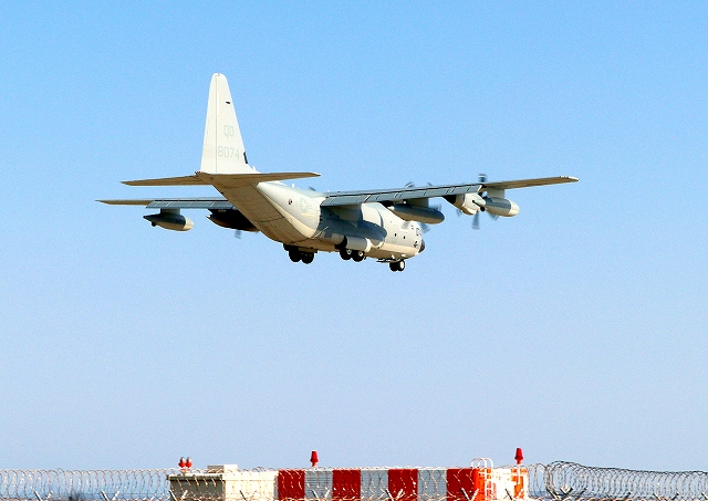 米海兵隊 KC-130J 空中給油機 スーパーハーキュリーズ(岩国基地)、QD 8074番機が着陸 |
