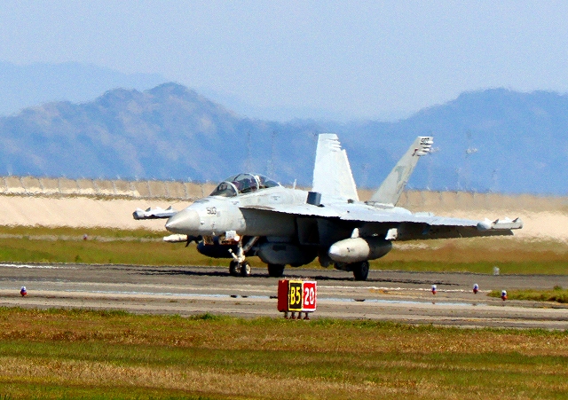 米海軍艦載機 EA-18G グラウラー 電子戦機戦闘攻撃機(岩国基地)、NF、500番機が着陸 |