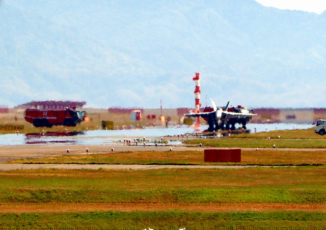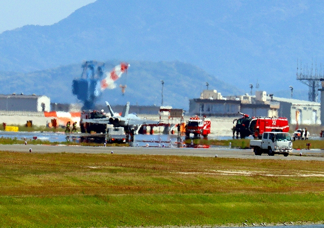 米海軍艦載機 F/A-18E スーパーホーネット 戦闘攻撃機(岩国基地)、NF、201番機は応急修理終わって、艦載機駐機に戻ります。点検?時間は13分間。滑走路閉鎖もそれくらい。良く訓練されていて、短時間で終わったの? |