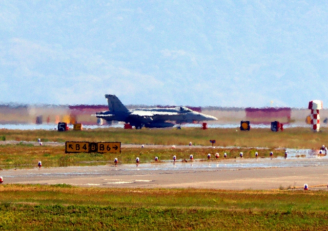 米海軍艦載機 F/A-18E スーパーホーネット 戦闘攻撃機(岩国基地)、NF、201番機は滑走路南端で点検 |
