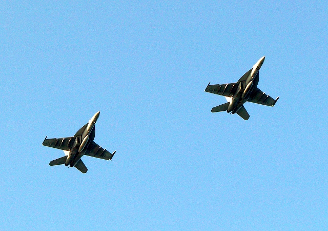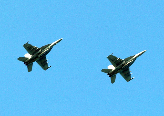 米海軍艦載機 F/A-18E スーパーホーネット 戦闘攻撃機(岩国基地)、NF、404番機、410番機が2機編隊で帰還 |