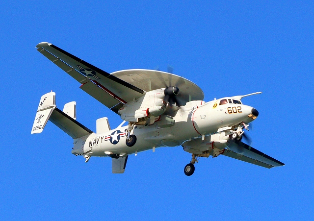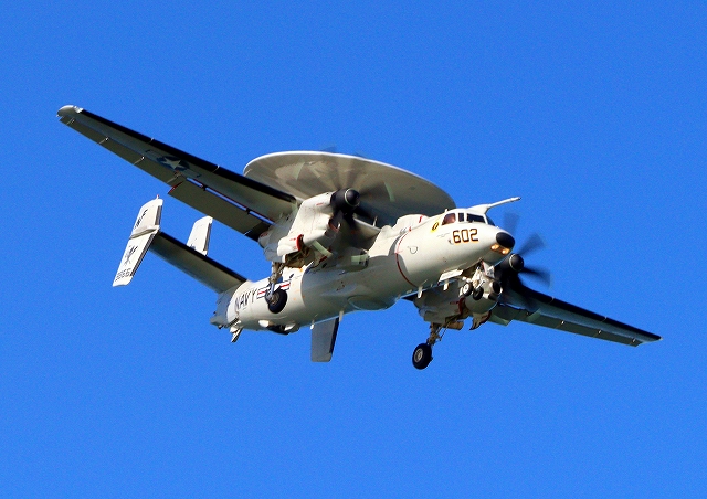 米海軍艦載機 E-2D アドヴァンスド・ホークアイ 早期警戒機(岩国基地)、602番機が旋回 |