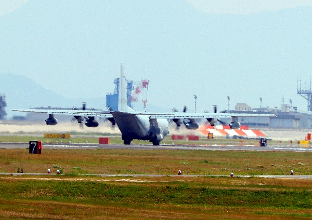 米海兵隊 KC-130J 空中給油機 スーパーハーキュリーズ(岩国基地)、QD 7926番機が離陸 |