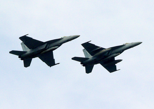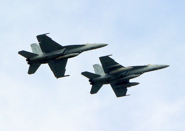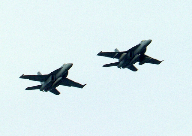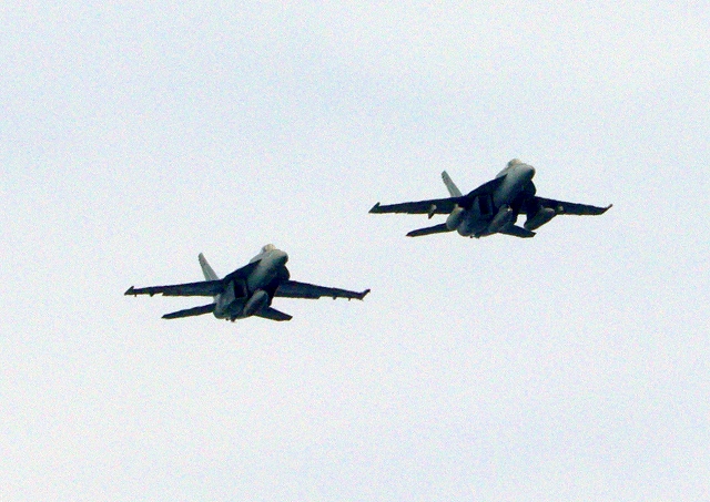 米海軍艦載機 F/A-18E スーパーホーネット 戦闘攻撃機(岩国基地)、NF、212番機、211番機が2機編隊で帰還 |