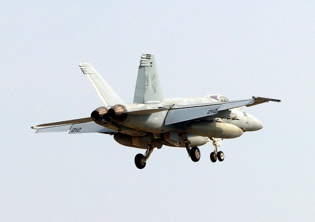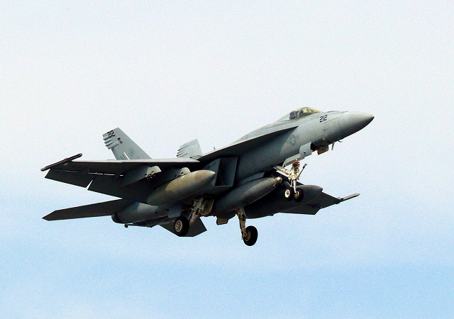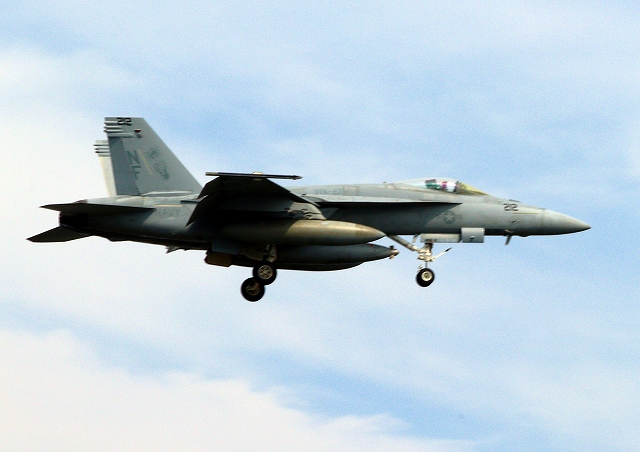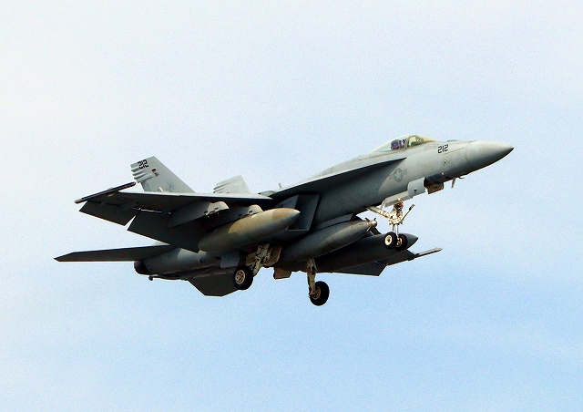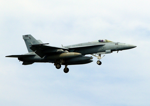 米海軍艦載機 F/A-18E スーパーホーネット 戦闘攻撃機(岩国基地)、NF、212番機が着陸 |