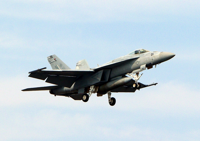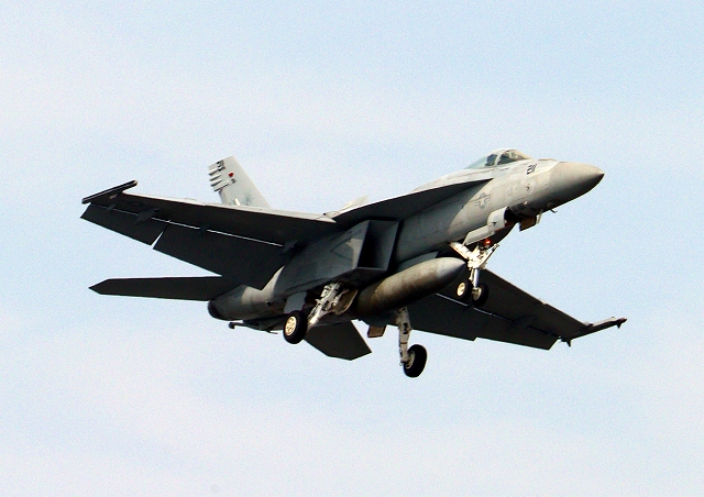 米海軍艦載機 F/A-18E スーパーホーネット 戦闘攻撃機(岩国基地)、NF、211番機が着陸 |