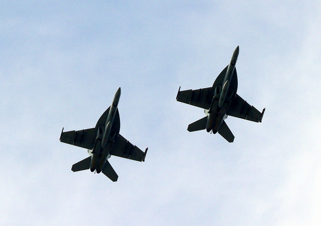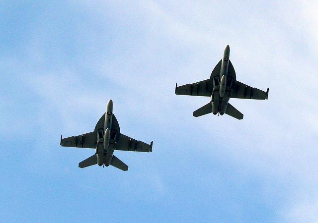 米海軍艦載機 F/A-18E スーパーホーネット 戦闘攻撃機(岩国基地)、NF、206番機、201番機が2機編隊で帰還 |