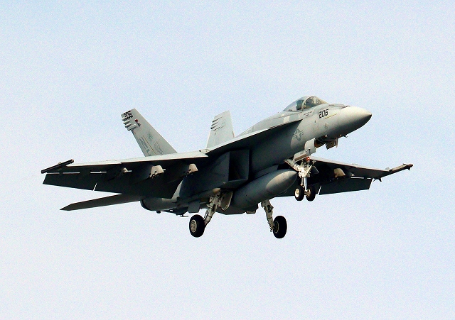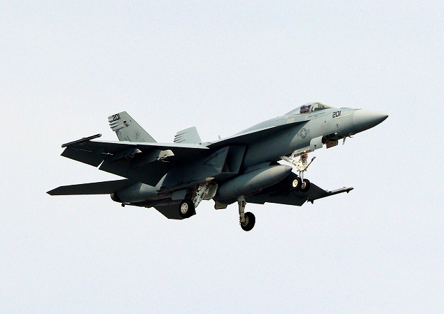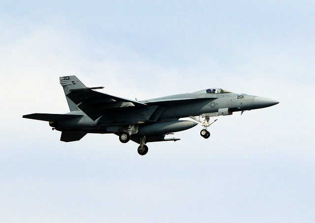 米海軍艦載機 F/A-18E スーパーホーネット 戦闘攻撃機(岩国基地)、NF、201番機が着陸 |