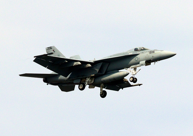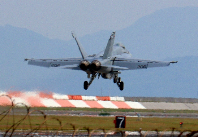 米海軍艦載機 F/A-18E スーパーホーネット 戦闘攻撃機(岩国基地)、NF、206番機が着陸 |