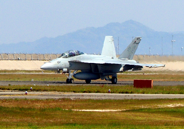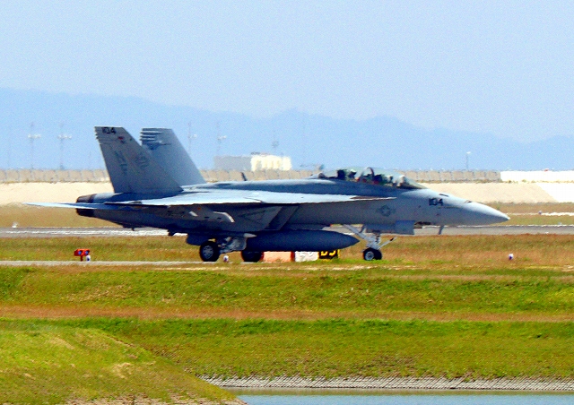 米海軍艦載機 F/A-18F スーパーホーネット 戦闘攻撃機(岩国基地)、NF、104番機が着陸 |