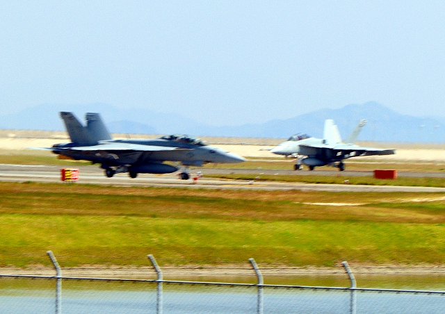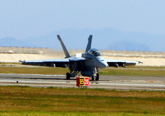 米海軍艦載機 F/A-18F スーパーホーネット 戦闘攻撃機(岩国基地)、NF、102番機が着陸 |