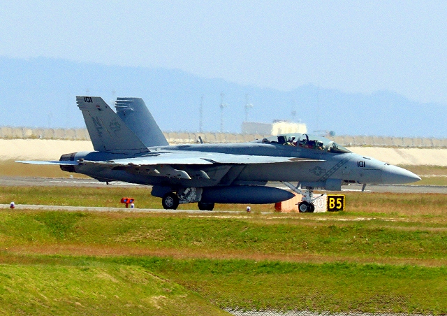 米海軍艦載機 F/A-18F スーパーホーネット 戦闘攻撃機(岩国基地)、NF、101番機が着陸、 |
