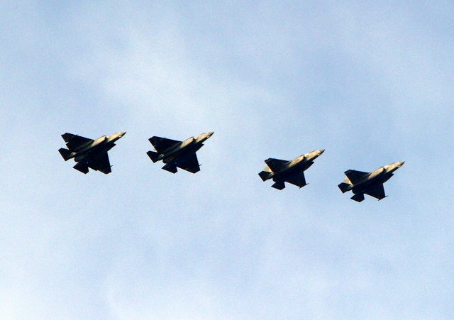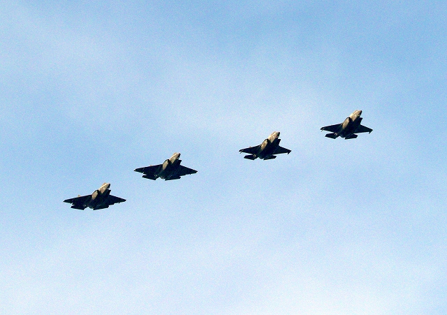 米海兵隊 F-35B ライトニングⅡ 戦闘機(岩国基地)、VK、11番機、09番機、米海軍艦載機 F-35C ライトニングⅡ 戦闘機(岩国基地)、NF、311番機、314番機が4機編隊で帰還 |