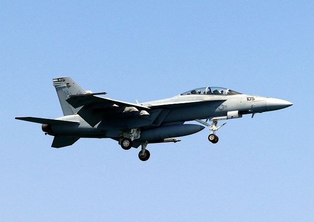 米海軍艦載機 F/A-18F スーパーホーネット 戦闘攻撃機(岩国基地)、NF、105番機が帰還 |