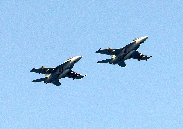 米海軍艦載機 F/A-18F スーパーホーネット 戦闘攻撃機(岩国基地)、NF、100番機、101番機が2機編隊で帰還 |