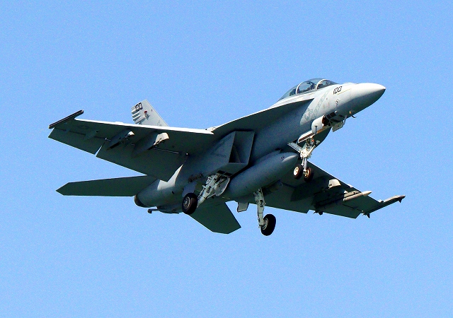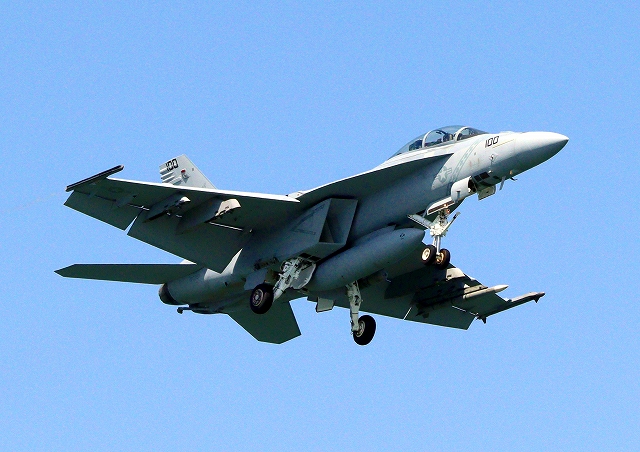 米海軍艦載機 F/A-18F スーパーホーネット 戦闘攻撃機(岩国基地)、NF、100番機が着陸 |
