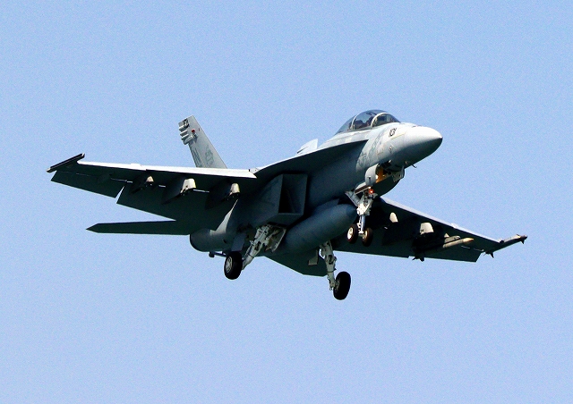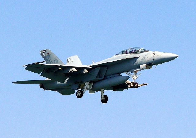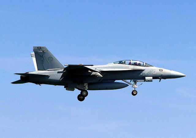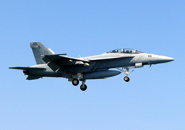 米海軍艦載機 F/A-18F スーパーホーネット 戦闘攻撃機(岩国基地)、NF、101番機が帰還 |