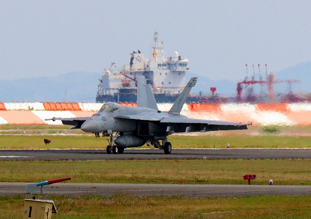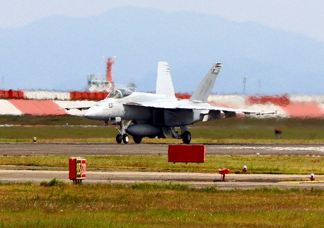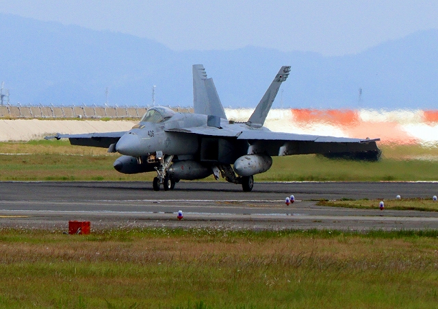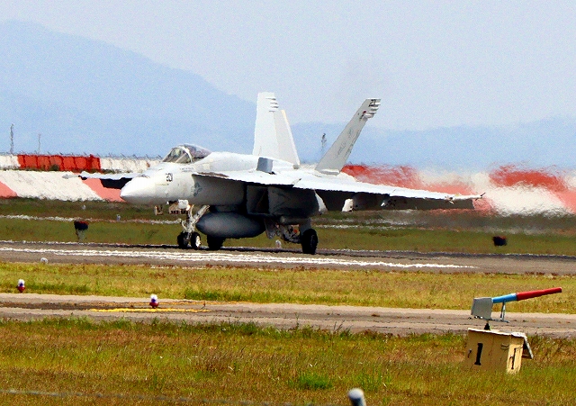 米海軍艦載機 F/A-18E スーパーホーネット 戦闘攻撃機(岩国基地)、NF 405番機が着陸 |