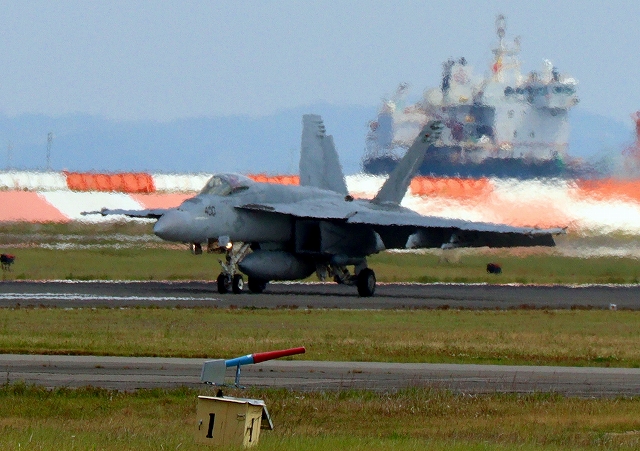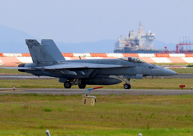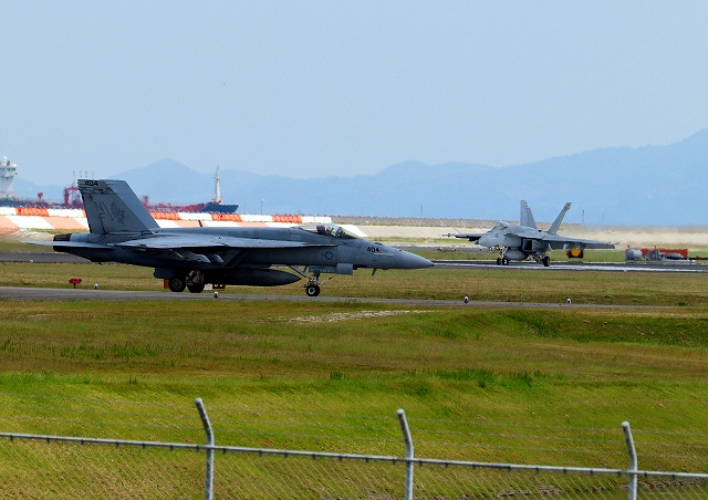 米海軍艦載機 F/A-18E スーパーホーネット 戦闘攻撃機(岩国基地)、NF 404番機が着陸 |