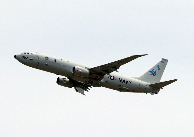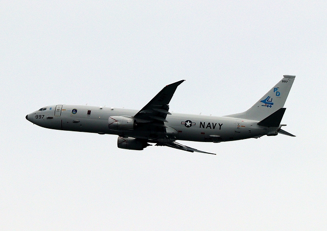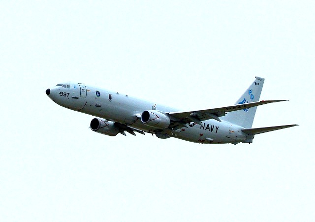 米海軍 P-8A 海上哨戒機 ポセイドン(嘉手納基地、三沢基地)、PD、997番機が旋回(2周目) |