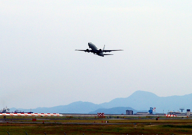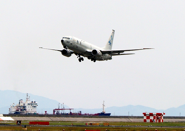 米海軍 P-8A 海上哨戒機 ポセイドン(嘉手納基地、三沢基地)、PD、997番機がタッチアンド・ゴーして旋回(8周目) |