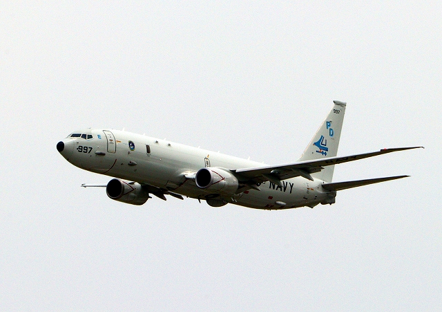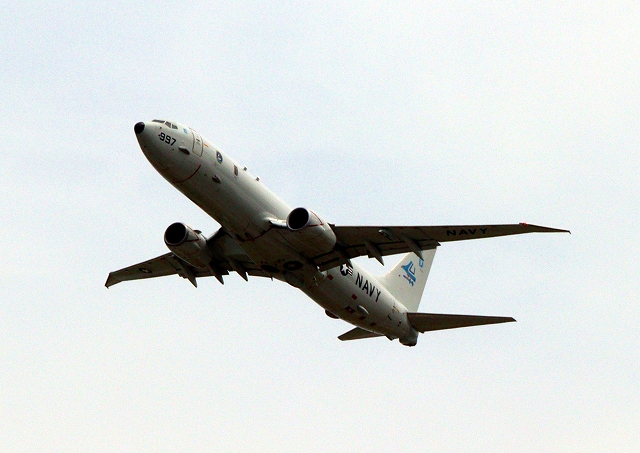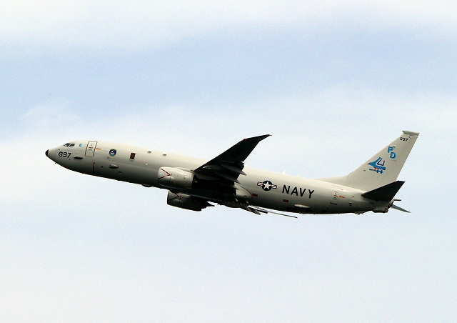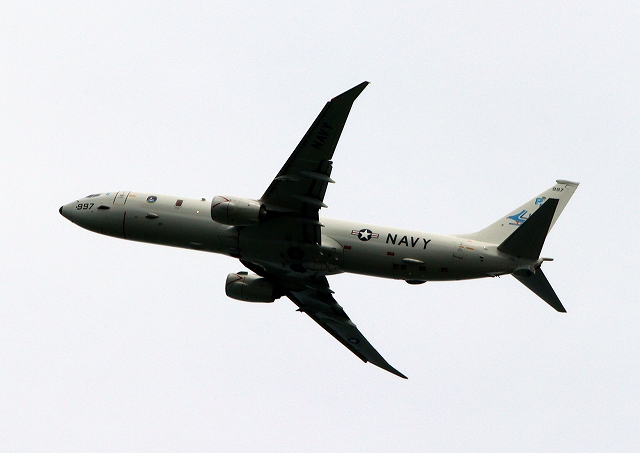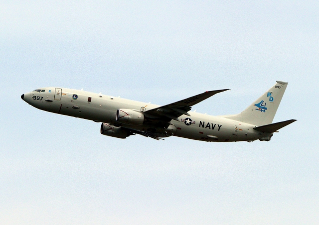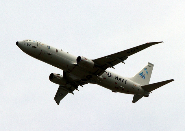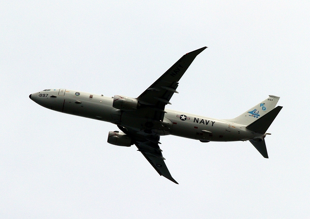 米海軍 P-8A 海上哨戒機 ポセイドン(嘉手納基地、三沢基地)、PD、997番機が旋回(10周目) |